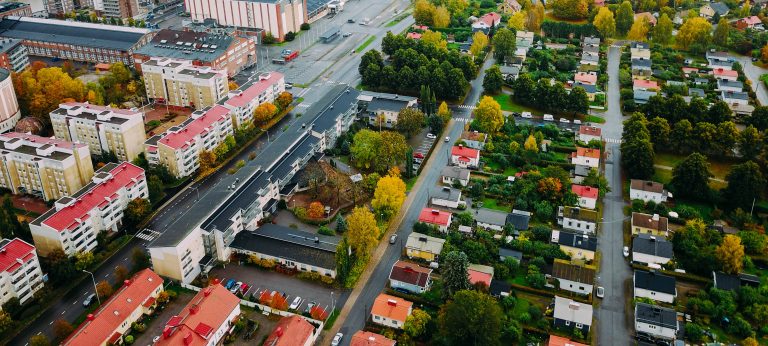 Omakotiliitto on pientalo- ja vapaa-ajan asukkaiden tuki, turva ja puolestapuhuja. Kuvassa perhe heittelee frisbeetä omakotitalon pihalla koiransa kanssa.