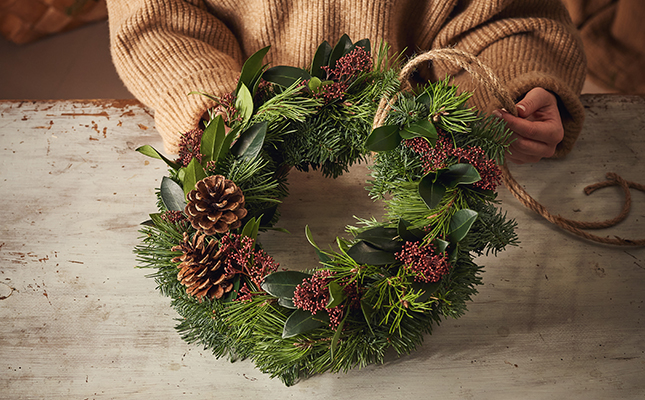 Lähde: Plantagen. Ohje ja kuvat julkaistu Plantagenin luvalla. Lisäys jälkikäteen: Plantagen meni konkurssiin 2024, mutta ohjevideo kranssin tekemiseen löytyy toistaiseksi Youtubesta.