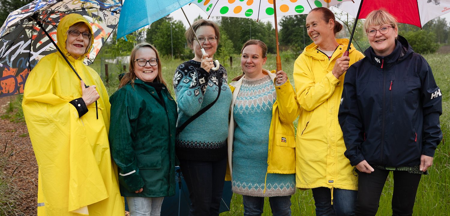 Haastattelua varten omayhdistyksen aktiiveja on kerääntynyt Puuttalaan koulun viereen. Sataa, mutta se ei porukan naurua hillitse.