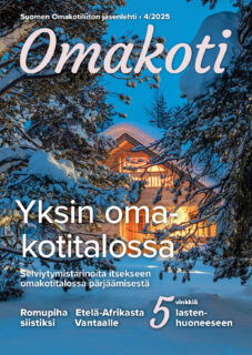 Omakotiliitto on pientalo- ja vapaa-ajan asukkaiden tuki, turva ja puolestapuhuja. Kuvassa perhe heittelee frisbeetä omakotitalon pihalla koiransa kanssa.