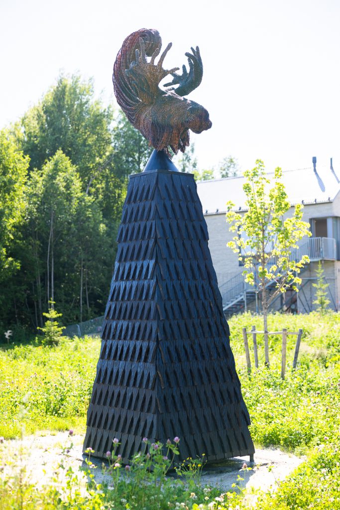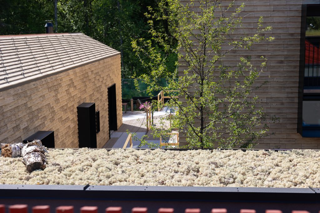 Alueen asemakaavassa on edellytetty viherkattoja, ja siksi messuilla kannattaa tähyillä myös ylös. Kuuden kohteen katolta löytyy jäkäläkatto. Se tarvitsee kasvualustakseen hiekkaa ja selviää vähällä vedellä. Myös lahopuuta on jätetty alueelle, kuten alla olevan kuvan katolle.