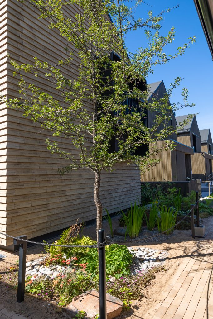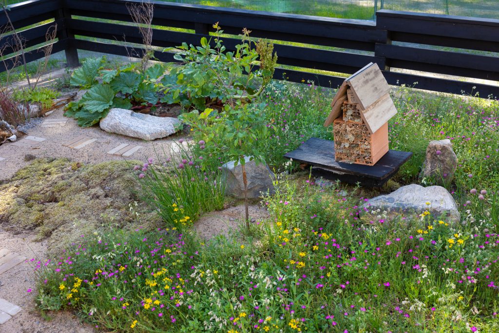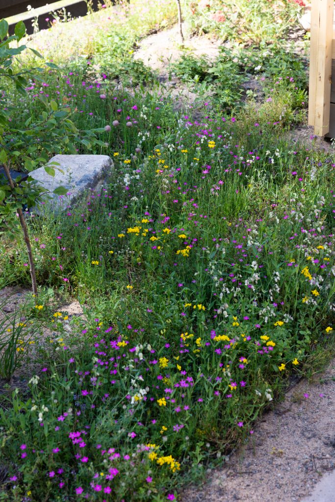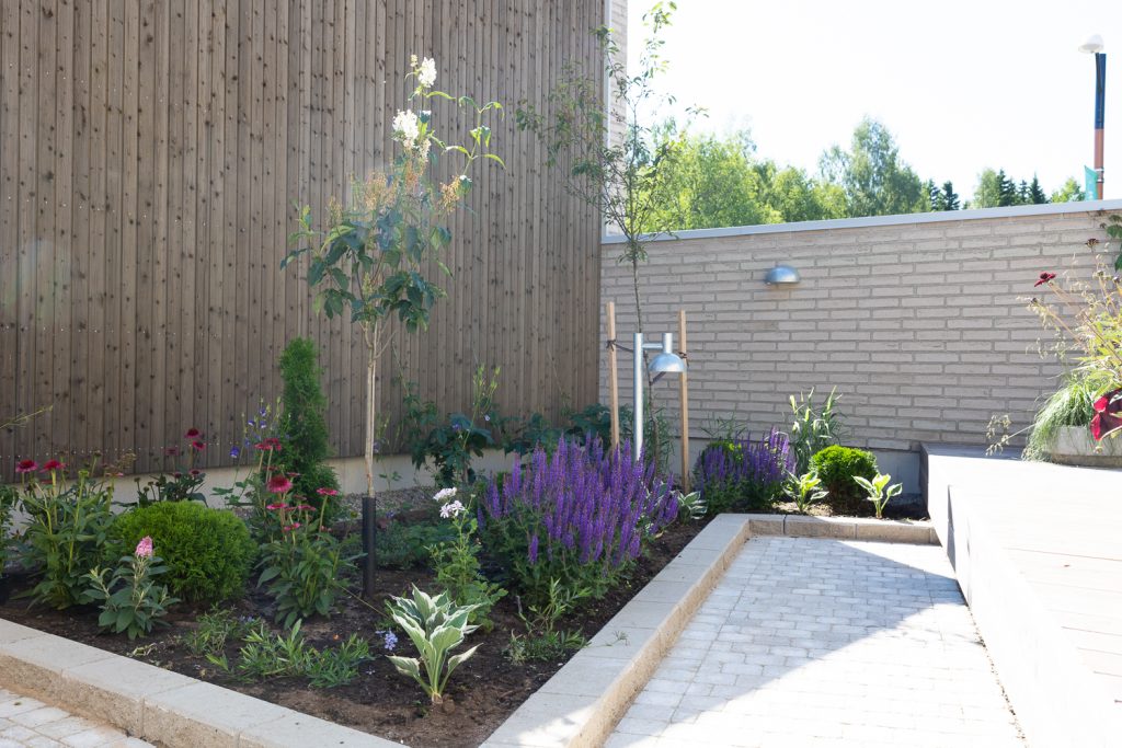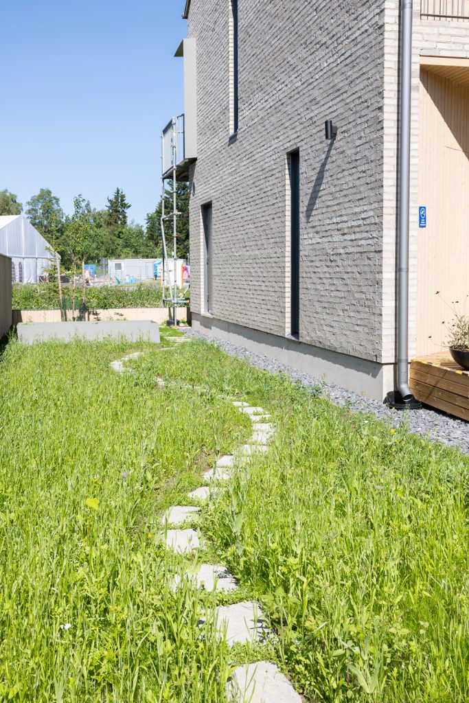 Ensimmäisenä huomio kiinnittyy niittykukkien runsauteen. Vihersuunnittelija Laura Moilanen kertoo, että hulevesiin ja niiden ohjaukseen pois rakennuksista ja tonteilta on kiinnitetty runsaasti huomiota, ääriolosuhteissa kun elellään. Ojiin ja painanteisiin on istutettu värikkäitä niittyjä. Jotta kukkivaa riittää koko kasvukauden, tarjoavat sipulikukat keväällä ensimmäisinä piristystä maisemaan.