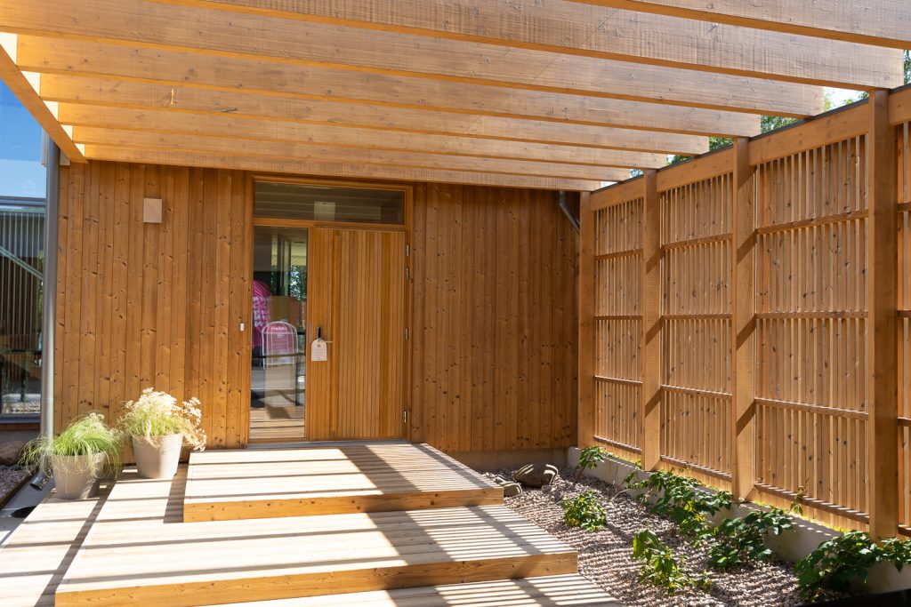 Missä oikeastaan alkaa ulkotila ja sisätila loppuu? Katetut terassit ja säleiköt laajentavat sisätilaa ja loiventavat rajaa. Hyvä esimerkki ulko- ja sisätilan rajan häilyvyydestä on Villa Prykä.