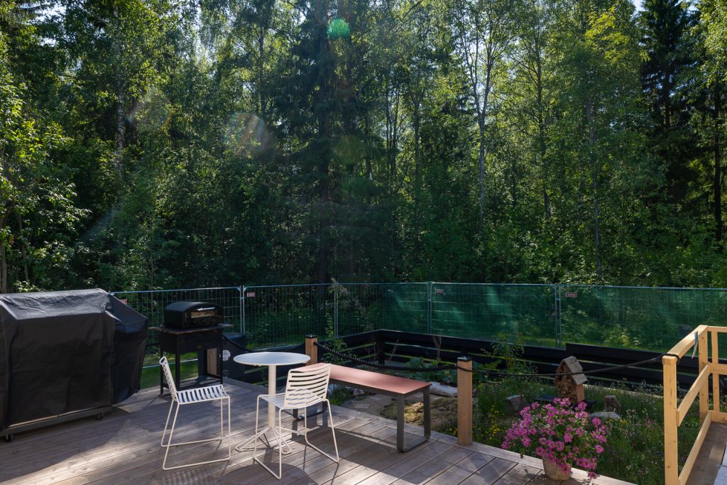 Hjemman pientä, metsään rajoittuvaa luontonurkkausta voi ihailla terassilta kesäkeittiöstä.