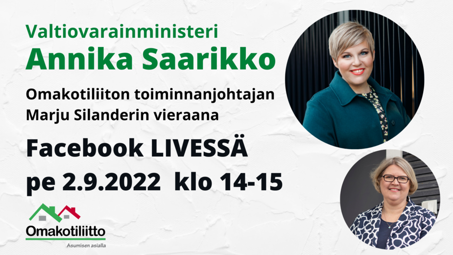 Valtiovarainministeri Annika Saarikko vieraana Omakotiliiton Facebook LIVESSÄ 2.9.2022 klo 14-15