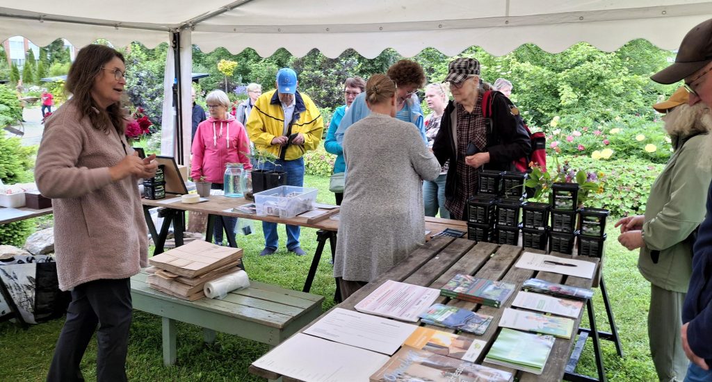 Energiakävelyn perusidean mukaisesti etenimme kävellen myös lopuksi Sarin pionipuistoon, jonka kahviteltassa oli aikamoinen vilske – kahvin lisäksi siellä myytiin sekä pionipuiston että Pionien Kodin taimia, ja vielä Pionistien laskuun pionien siemeniä ja arpoja, joista joka toinen voitti.